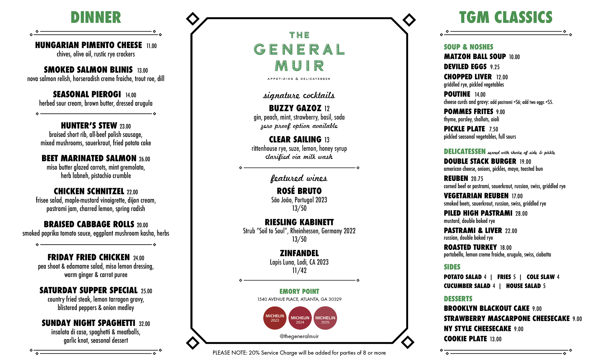 The General Muir, established in January 2013 at Emory Point, is a modern American restaurant inspired by classic New York Jewish Deli, returning it to its hand-crafted roots. Traditional favorites are honored — pastrami is cured and smoked in house, bagels are hand rolled and kettle boiled — and joined by dishes going beyond tradition, focusing on fresh ingredients and simple preparations.